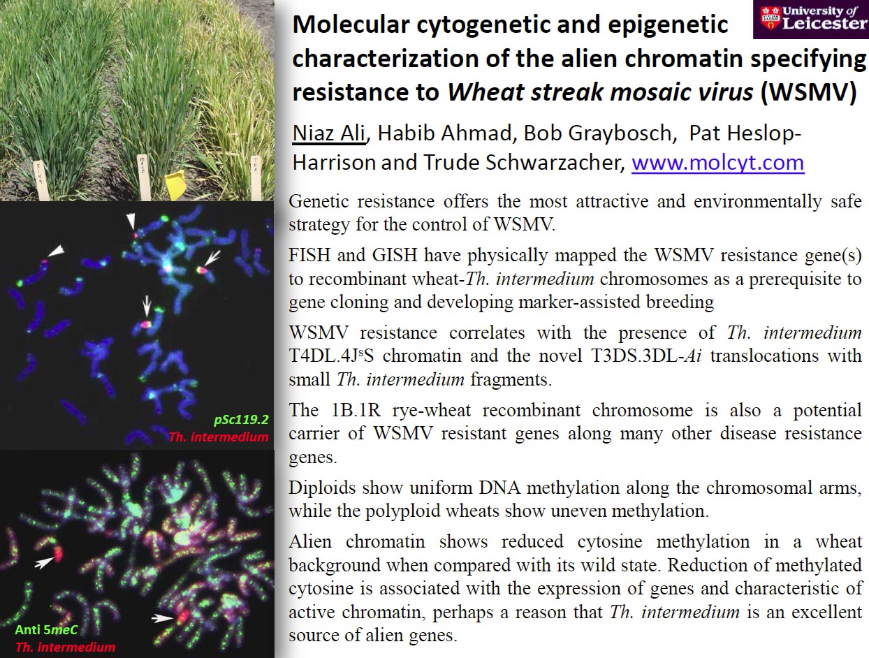 Decades of selection for greater yield and the failure to secure primitive cultivated landraces have given rise to a substantial loss of genetic diversity in hexaploid bread wheat (Triticum aestivum). Wheat streak mosaic virus (WSMV) is one of the major yield-limiting diseases of winter wheat. While effective resistance in wheat has recently been described in only one case, the Wsm2 gene, more successful resistance has been introgressed from the related intermediate wheatgrass, Thinopyrum intermedium, as Wsm1 and Wsm3 genes. Fluorescent in situ hybridization (FISH) with genomic DNA from Th. intermedium, Aegilops tauschii, Secale cereale and repetitive DNA probes was applied to four breeding populations of wheat–Th. intermedium hybrid lines. Three different wheat recombinant chromosomes, the well-known 4Ai#2S and two novel, 1B and 3D, were associated with WSMV resistance. These novel introgressed genes from wheatgrass and rye were designated Wsm4 and Wsm5, respectively. To facilitate marker-assisted selection (MAS), seven new PCR-markers, six linked to Wsm1 and one to Wsm5 were identified. The new markers provide a good coverage of the 4Ai#2S arm and these genes increase our arsenal to combat the disease. Our work is also aiming at understanding the interaction of chromatin from different origins. We studied epigenetic modification using diploid and polyploid progenitors as well as hybrid lines using Southern hybridization, with methylation-sensitive restriction enzymes and immunostaining with anti-5-methyl-cytosine antibodies. Overall, no massive changes were evident in the wheat genome, however the alien arm showed reduced cytosine methylation, which is characteristic for the actively transcribing chromatin.