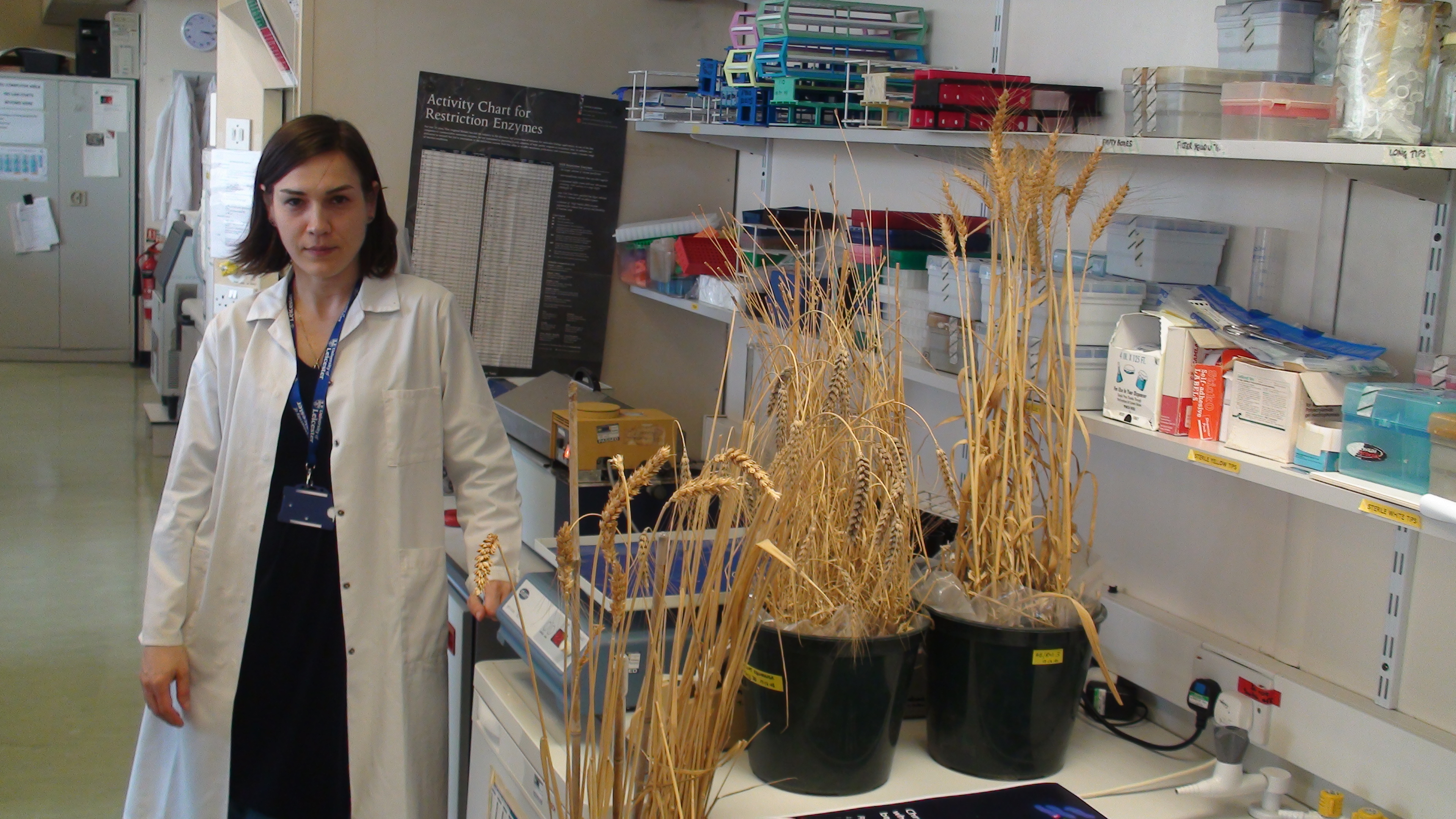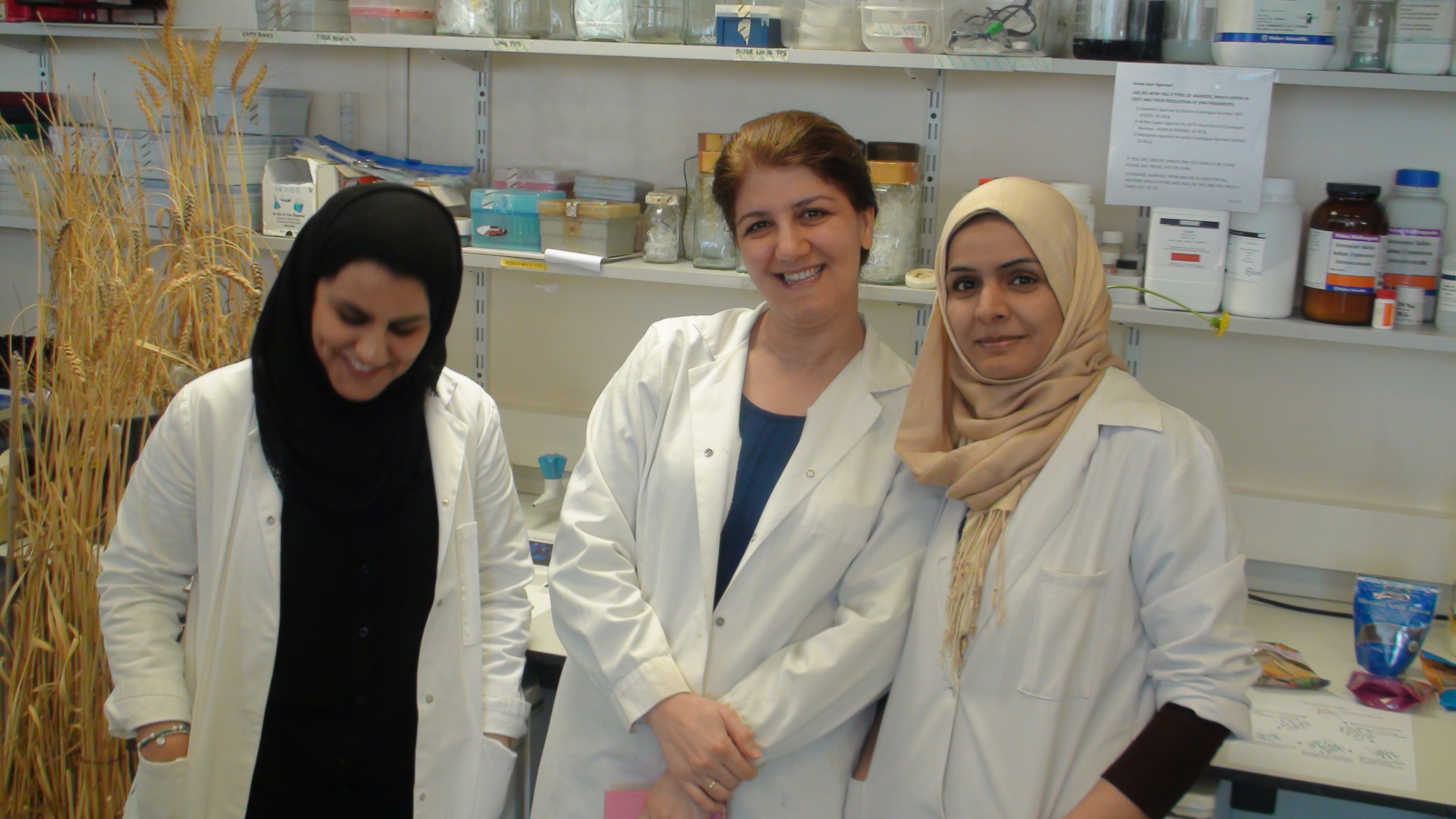 From left to right, left of DNA molecule: Amal Alyamani (Wheat repetitive DNA), Ramesh Patel (Technical), Chetan Patokar (Wheat-Thinopyrum introgression), Rubar Salih (Taraxacum diversity), Pat Heslop-Harrison, Juceli Gouveia (Fish microsatellite organization) ; Sarbast Mustafa (Sheep and bovid satellite DNA diversity). Right of DNA molecule: Trude Schwarzacher, Jotyar Mohammed (Aubrieta biodiversity), Khaloud Alarjani (Brassica repetitive DNA), Stuart Desjardins (Fallopia/Knotweed relationships), Nouf Alsayied (then registered as Nauf Alsayid/Alsayied; Saffron and Crocus diversity), Fabiola Santos Carvalho (Brachiaria forage grass molecular cytogenetics; her picture is inserted). Adel Sepsi (Centromeres and epigenetics in wheat introgression lines).