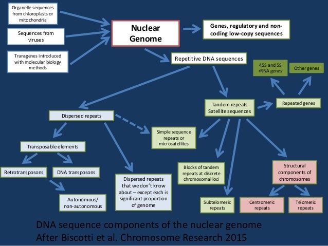 - 30. Organelle sequences from chloroplasts or mitochondria Sequences from viruses Transgenes introduced with molecular biology methods Genes, regulatory and non- coding low-copy sequences Dispersed repeats Repetitive DNA sequences Nuclear Genome Tandem repeats Satellite sequences DNA transposonsRetrotransposons Centromeric repeats Structural components of chromosomes Telomeric repeats Simple sequence repeats or microsatellites Repeated genes Subtelomeric repeats 45S and 5S rRNA genes Blocks of tandem repeats at discrete chromosomal loci DNA sequence components of the nuclear genome After Biscotti et al. Chromosome Research 2015 Other genes Transposable elements Autonomous/ non-autonomous Dispersed repeats that we don’t know about – except each is significant proportion of genome