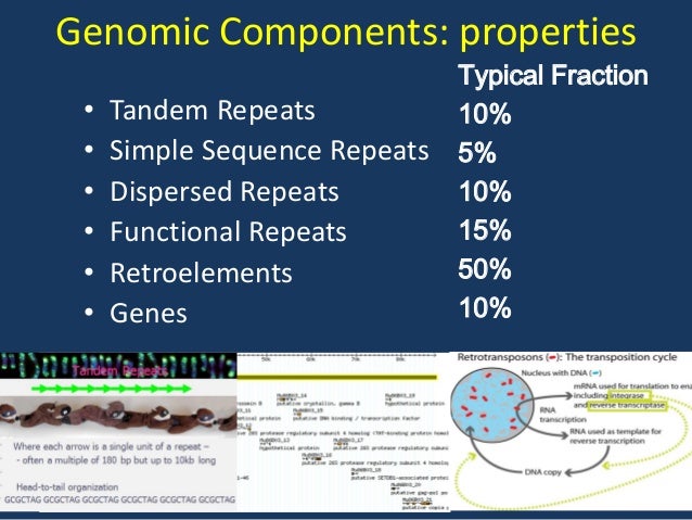 - 12. Genomic Components: properties • Tandem Repeats • Simple Sequence Repeats • Dispersed Repeats • Functional Repeats • Retroelements • Genes Typical Fraction 10% 5% 10% 15% 50% 10%