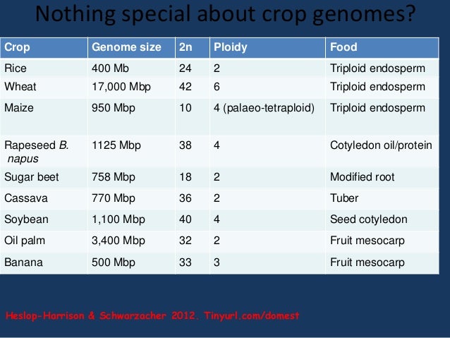 - 14. Nothing special about crop genomes? Crop Genome size 2n Ploidy Food Rice 400 Mb 24 2 Triploid endosperm Wheat 17,000 Mbp 42 6 Triploid endosperm Maize 950 Mbp 10 4 (palaeo-tetraploid) Triploid endosperm Rapeseed B. napus 1125 Mbp 38 4 Cotyledon oil/protein Sugar beet 758 Mbp 18 2 Modified root Cassava 770 Mbp 36 2 Tuber Soybean 1,100 Mbp 40 4 Seed cotyledon Oil palm 3,400 Mbp 32 2 Fruit mesocarp Banana 500 Mbp 33 3 Fruit mesocarp Heslop-Harrison & Schwarzacher 2012. Tinyurl.com/domest