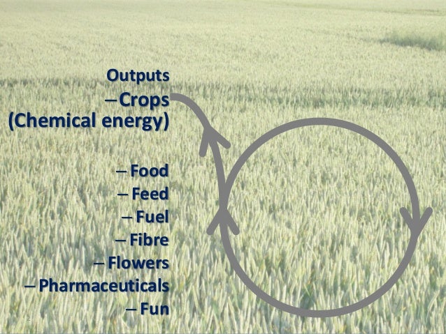 - 2. Outputs –Crops (Chemical energy) – Food – Feed – Fuel – Fibre – Flowers – Pharmaceuticals – Fun2