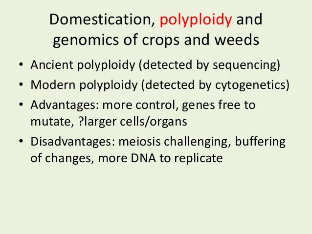 - 18. Domestication, polyploidy and genomics of crops and weeds • Ancient polyploidy (detected by sequencing) • Modern polyploidy (detected by cytogenetics) • Advantages: more control, genes free to mutate, ?larger cells/organs • Disadvantages: meiosis challenging, buffering of changes, more DNA to replicate