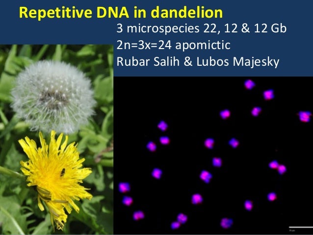 - 19. Repetitive DNA in dandelion 3 microspecies 22, 12 & 12 Gb 2n=3x=24 apomictic Rubar Salih & Lubos Majesky