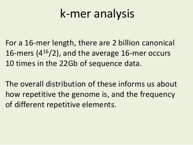 - 20. k-mer analysis For a 16-mer length, there are 2 billion canonical 16-mers (416/2), and the average 16-mer occurs 10 times in the 22Gb of sequence data. The overall distribution of these informs us about how repetitive the genome is, and the frequency of different repetitive elements.
