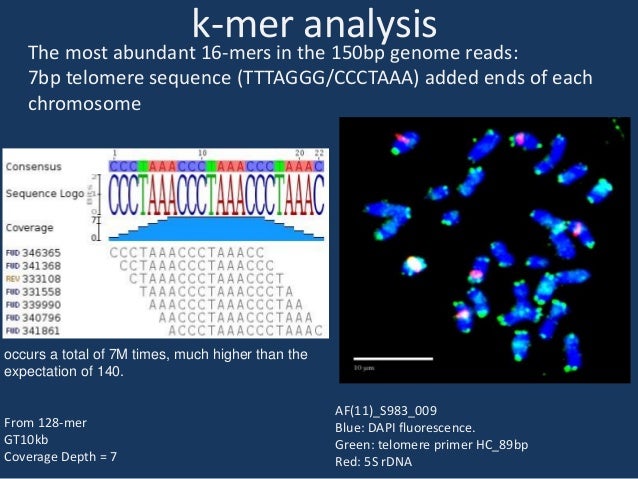 - 21. k-mer analysis The most abundant 16-mers in the 150bp genome reads: 7bp telomere sequence (TTTAGGG/CCCTAAA) added ends of each chromosome occurs a total of 7M times, much higher than the expectation of 140. From 128-mer GT10kb Coverage Depth = 7 AF(11)_S983_009 Blue: DAPI fluorescence. Green: telomere primer HC_89bp Red: 5S rDNA