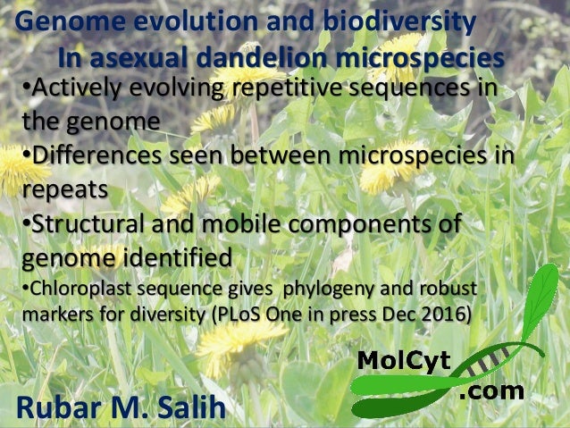 - 22. In asexual dandelion microspecies Rubar M. Salih Genome evolution and biodiversity •Actively evolving repetitive sequences in the genome •Differences seen between microspecies in repeats •Structural and mobile components of genome identified •Chloroplast sequence gives phylogeny and robust markers for diversity (PLoS One in press Dec 2016)
