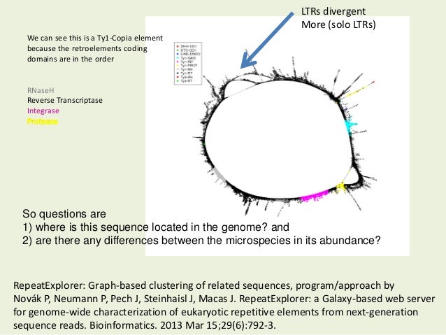 - 23. So questions are 1) where is this sequence located in the genome? and 2) are there any differences between the microspecies in its abundance? We can see this is a Ty1-Copia element because the retroelements coding domains are in the order RNaseH Reverse Transcriptase Integrase LTRs divergent More (solo LTRs) RepeatExplorer: Graph-based clustering of related sequences, program/approach by Novák P, Neumann P, Pech J, Steinhaisl J, Macas J. RepeatExplorer: a Galaxy-based web server for genome-wide characterization of eukaryotic repetitive elements from next-generation sequence reads. Bioinformatics. 2013 Mar 15;29(6):792-3.