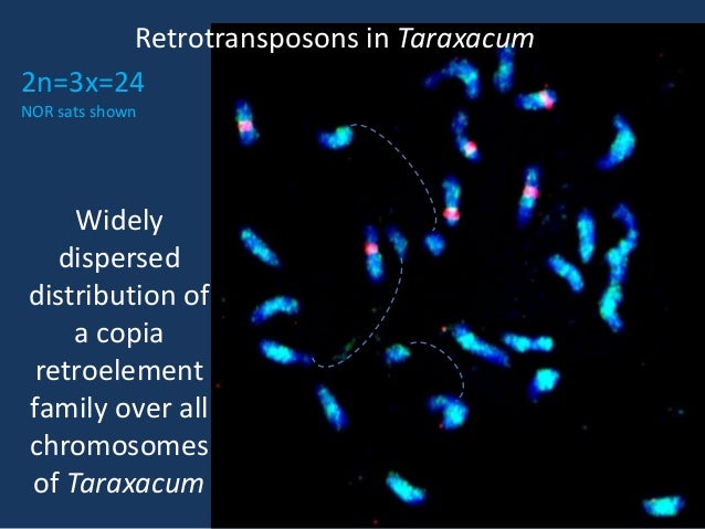 - 24. Widely dispersed distribution of a copia retroelement family over all chromosomes of Taraxacum Retrotransposons in Taraxacum 2n=3x=24 NOR sats shown