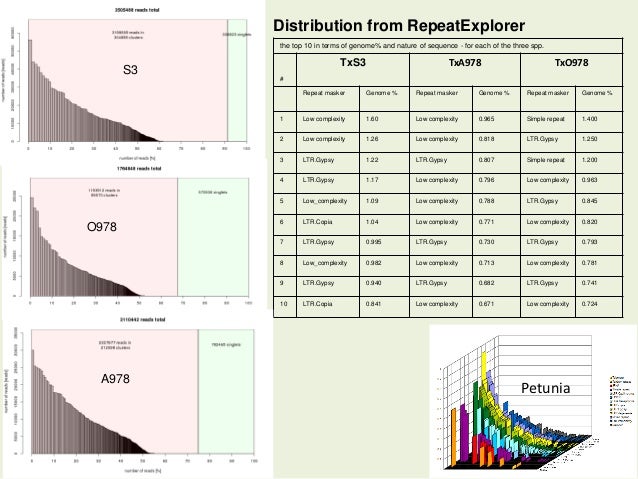 - 25. Distribution from RepeatExplorer O978 the top 10 in terms of genome% and nature of sequence – for each of the three spp. # TxS3 TxA978 TxO978 Repeat masker Genome % Repeat masker Genome % Repeat masker Genome % 1 Low complexity 1.60 Low complexity 0.965 Simple repeat 1.400 2 Low complexity 1.26 Low complexity 0.818 LTR.Gypsy 1.250 3 LTR.Gypsy 1.22 LTR.Gypsy 0.807 Simple repeat 1.200 4 LTR.Gypsy 1.17 Low complexity 0.796 Low complexity 0.963 5 Low_complexity 1.09 Low complexity 0.788 LTR.Gypsy 0.845 6 LTR.Copia 1.04 Low complexity 0.771 Low complexity 0.820 7 LTR.Gypsy 0.995 LTR.Gypsy 0.730 LTR.Gypsy 0.793 8 Low_complexity 0.982 Low complexity 0.713 Low complexity 0.781 9 LTR.Gypsy 0.940 LTR.Gypsy 0.682 LTR.Gypsy 0.741 10 LTR.Copia 0.841 Low complexity 0.671 Low complexity 0.724 S3 A978 Petunia