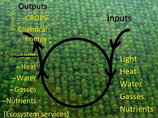 - 3. Inputs –Light –Heat –Water –Gasses –Nutrients –Light –Heat –Water –Gasses –Nutrients (Ecosystem services) Outputs –CROPS – Chemical energy