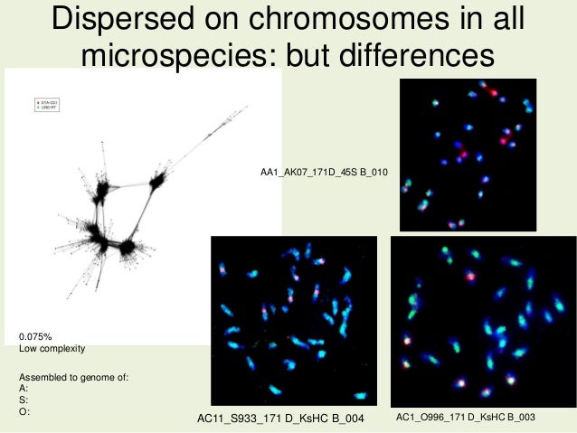 - 27. Dispersed on chromosomes in all microspecies: but differences AA1_AK07_171D_45S B_010 AC1_O996_171 D_KsHC B_003AC11_S933_171 D_KsHC B_004 0.075% Low complexity Assembled to genome of: A: S: O: