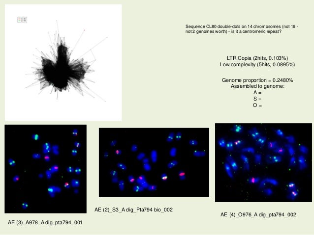 - 28. Sequence CL80 double-dots on 14 chromosomes (not 16 – not 2 genomes worth) – is it a centromeric repeat? LTR.Copia (2hits, 0.103%) Low complexity (5hits, 0.0895%) Genome proportion = 0.2480% Assembled to genome: A = S = O = AE (3)_A978_A dig_pta794_001 AE (4)_O976_A dig_pta794_002 AE (2)_S3_A dig_Pta794 bio_002