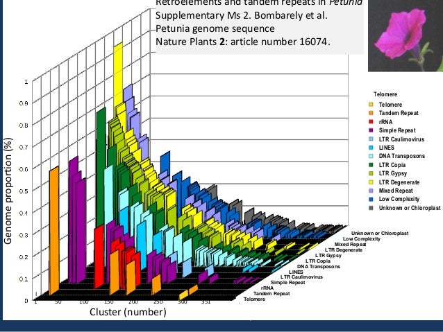 - 29. Unknown or Chloroplast Low Complexity Mixed Repeat LTR Degenerate LTR Gypsy LTR Copia DNA Transposons LINES LTR Caulimovirus Simple Repeat rRNA Tandem Repeat Telomere Genomeproportion(%) Cluster (number) I I I I I I I I 1 50 100 150 200 250 300 351 Telomere Tandem Repeat rRNA Simple Repeat LTR Caulimovirus LINES DNA Transposons LTR Copia LTR Gypsy LTR Degenerate Mixed Repeat Low Complexity Unknown or Chloroplast Retroelements and tandem repeats in Petunia Supplementary Ms 2. Bombarely et al. Petunia genome sequence Nature Plants 2: article number 16074. Telomere Tandem Repeat rRNA Simple Repeat LTR Caulimovirus LINES DNA Transposons LTR Copia LTR Gypsy LTR Degenerate Mixed Repeat Low Complexity Unknown or Chloroplast
