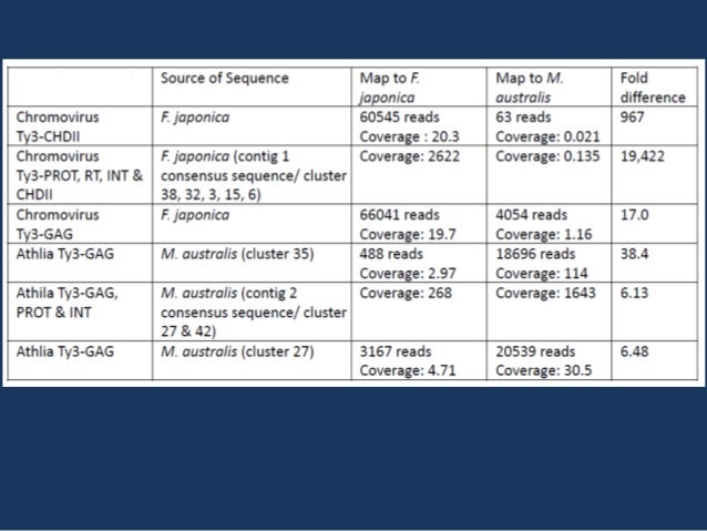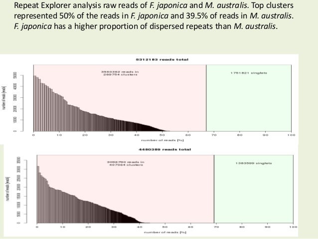 - 32. Repeat Explorer analysis raw reads of F. japonica and M. australis. Top clusters represented 50% of the reads in F. japonica and 39.5% of reads in M. australis. F. japonica has a higher proportion of dispersed repeats than M. australis.