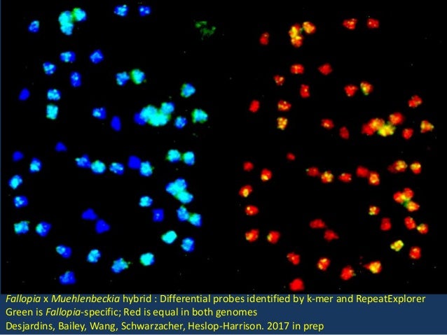 - 33. Fallopia x Muehlenbeckia hybrid : Differential probes identified by k-mer and RepeatExplorer Green is Fallopia-specific; Red is equal in both genomes Desjardins, Bailey, Wang, Schwarzacher, Heslop-Harrison. 2017 in prep