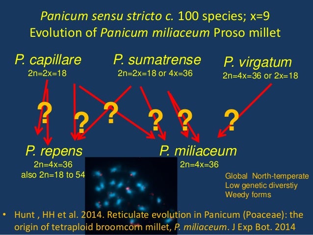 - 35. Panicum sensu stricto c. 100 species; x=9 Evolution of Panicum miliaceum Proso millet P. miliaceum 2n=4x=36 P. capillare 2n=2x=18 P. repens 2n=4x=36 also 2n=18 to 54 P. sumatrense 2n=2x=18 or 4x=36 Global North-temperate Low genetic diverstiy Weedy forms P. virgatum 2n=4x=36 or 2x=18 ? ? ? ? ?? • Hunt , HH et al. 2014. Reticulate evolution in Panicum (Poaceae): the origin of tetraploid broomcorn millet, P. miliaceum. J Exp Bot. 2014
