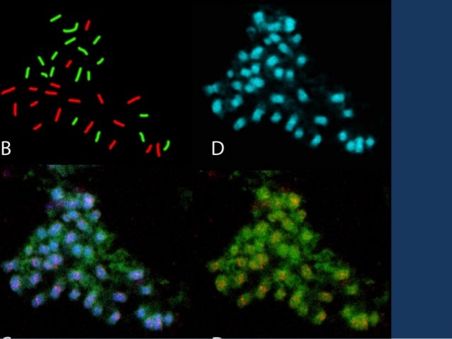 - 37. Nicotiana hybrid 4x + 4x cell fusions Each of 4 chromosome sets has distinctive repetitive DNA when probed with genomic DNA Patel et al Ann Bot 2011 Cell fusion hybrid of two 4x tetraploid tobacco species Four genomes differentially labelled Patel, Badakshi, HH, Davey et al 2011 Annals Botany