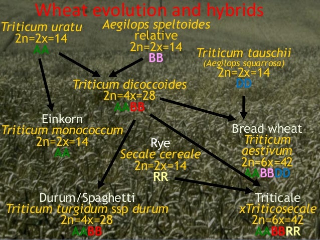 - 38. Wheat evolution and hybrids Triticum uratu 2n=2x=14 AA Einkorn Triticum monococcum 2n=2x=14 AA Bread wheat Triticum aestivum 2n=6x=42 AABBDD Durum/Spaghetti Triticum turgidum ssp durum 2n=4x=28 AABB Triticum dicoccoides 2n=4x=28 AABB Aegilops speltoides relative 2n=2x=14 BB Triticum tauschii (Aegilops squarrosa) 2n=2x=14 DD Triticale xTriticosecale 2n=6x=42 AABBRR Rye Secale cereale 2n=2x=14 RR