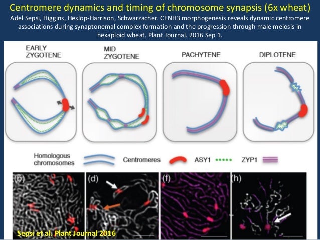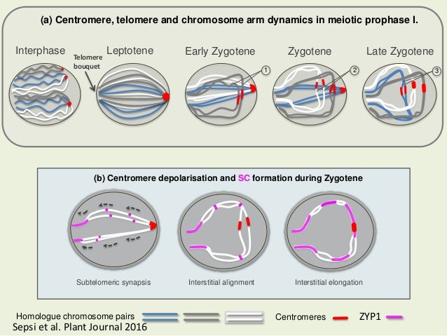 - 40. (b) Centromere depolarisation and SC formation during Zygotene Interphase Leptotene Zygotene Late ZygoteneTelomere bouquet Homologue chromosome pairs Centromeres ZYP1 Early Zygotene 1 2 3 Subtelomeric synapsis Interstitial alignment Interstitial elongation (a) Centromere, telomere and chromosome arm dynamics in meiotic prophase I. Sepsi et al. Plant Journal 2016